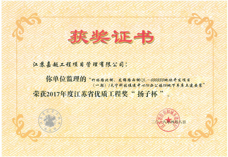 江苏省优质工程奖“扬子杯”2017年竹林路北侧、龙锦路西侧QL-030333地块开发项目(一期)