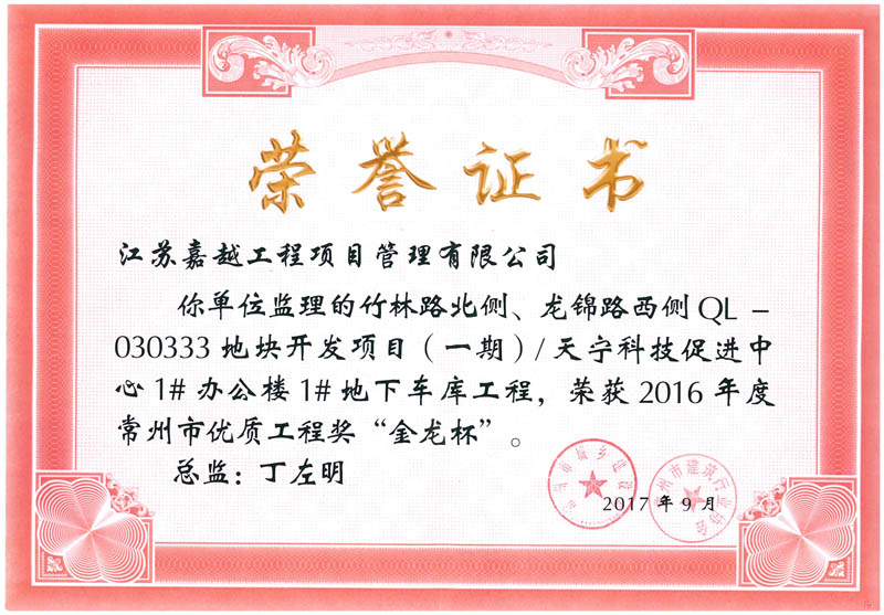 常州市优质工程奖“金龙杯”2016年竹林路北侧、龙锦路西侧QL-030333地块开发项目一期