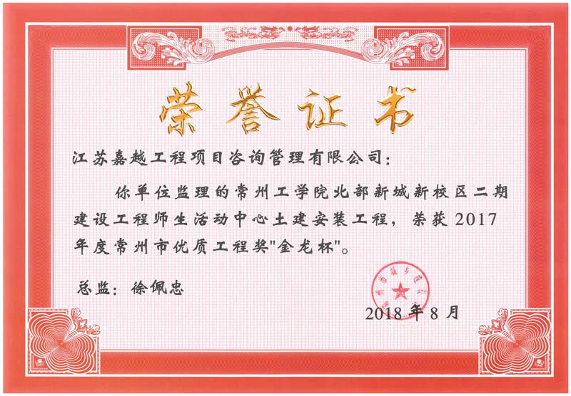 常州市优质工程奖“金龙杯”2017年常州工学院北部新城新校区二期建设工程师生活动中心土建安装工程